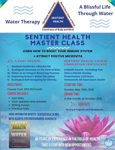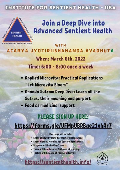 We offer an Advanced Sentient Health blissful program involving practical Microvita explorations, Ananda Sutram studies, and acid/alkaline diet - all in accordance to P. R. Sarkar's teachings on health and healing.